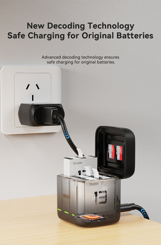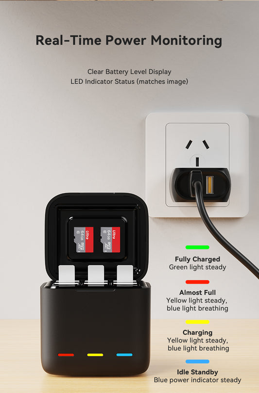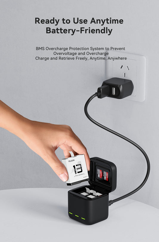 Die Telesin Charging Box lädt drei GoPro Hero 13 Akkus gleichzeitig. So sind Sie immer bereit, die wichtigen Momente festzuhalten, ohne warten zu müssen, bis ein einzelner Akku geladen ist. Dies ist besonders nützlich bei langen Dreharbeiten oder auf Reisen, wo der Zugang zu Steckdosen eingeschränkt sein kann.