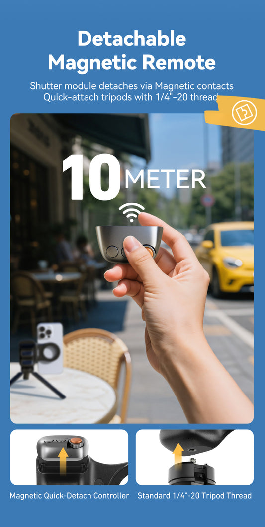 Der Griff verfügt über einen abnehmbaren Bluetooth-Auslöser. Damit können Sie mühelos aus der Ferne Fotos machen und Videos starten oder stoppen. Dies ist ideal für Gruppenfotos, Selfies oder Aufnahmen, bei denen Sie nicht in der Nähe Ihres Telefons sein können.