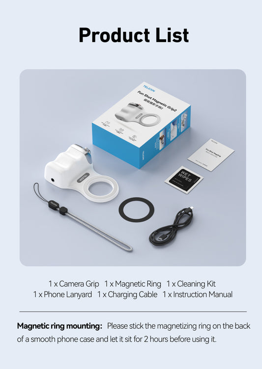 Mit einem Gewicht von nur 109 Gramm ist der Fun Shot Magnetic Grip 2 leicht und kompakt. Seine Abmessungen machen es einfach, den Griff in Ihrer Tasche oder sogar in Ihrer Jackentasche mitzunehmen. Die mitgelieferte Handschlaufe bietet zusätzliche Sicherheit, damit Sie den Griff und Ihr Telefon nicht versehentlich fallen lassen.