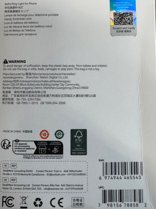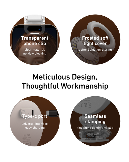 Das Licht verfügt über eine praktische Klemme, mit der Sie es sicher an Ihrem Smartphone befestigen können. Die Klemme hat eine Aussparung, sodass die Kamera Ihres Telefons frei bleibt und nicht blockiert wird. Dieses Design stellt sicher, dass Sie das Licht schnell anbringen und entfernen können, ohne Ihre Kamera zu beeinträchtigen.