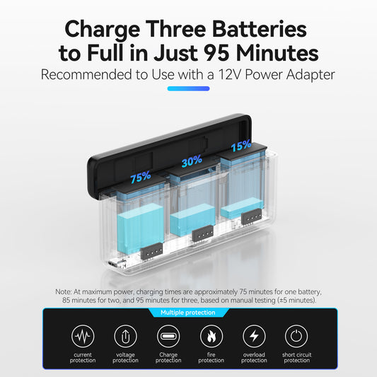 Die Ladebox unterstützt schnelles Laden über den USB-C-Anschluss. Mit einem geeigneten Adapter (12V/2A oder höher) können Sie drei Akkus in nur 75 Minuten vollständig aufladen. Die praktischen LED-Anzeigen zeigen den Ladestatus für jeden Akku in vier Stufen an, sodass Sie genau wissen, wann sie einsatzbereit sind.