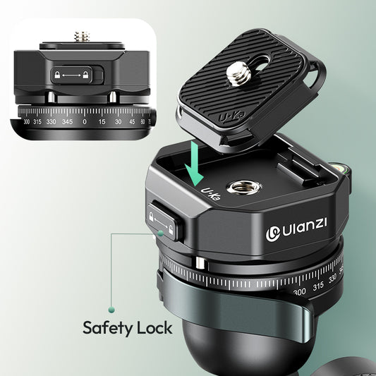 Das Stativ ist mit einem Uka-Schnellwechselsystem am Kugelkopf ausgestattet. Damit können Sie Ihre Kamera schnell und sicher befestigen und wieder abnehmen. Das spart Zeit beim Einrichten Ihrer Aufnahmeausrüstung, und die mitgelieferten Schrauben sorgen dafür, dass Sie sofort loslegen können.