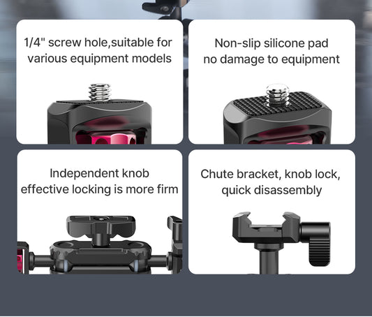 Der Magic Arm ist mit einer Standard-1/4''-Schraube ausgestattet, wodurch er mit den meisten Systemkameras, DSLRs, Kompaktkameras und Action-Cams kompatibel ist. Sie können auch anderes Zubehör mit einem 1/4''-Schraubenloch anbringen. Dadurch ist der Saugnapf für verschiedene Aufnahmesituationen breit einsetzbar.