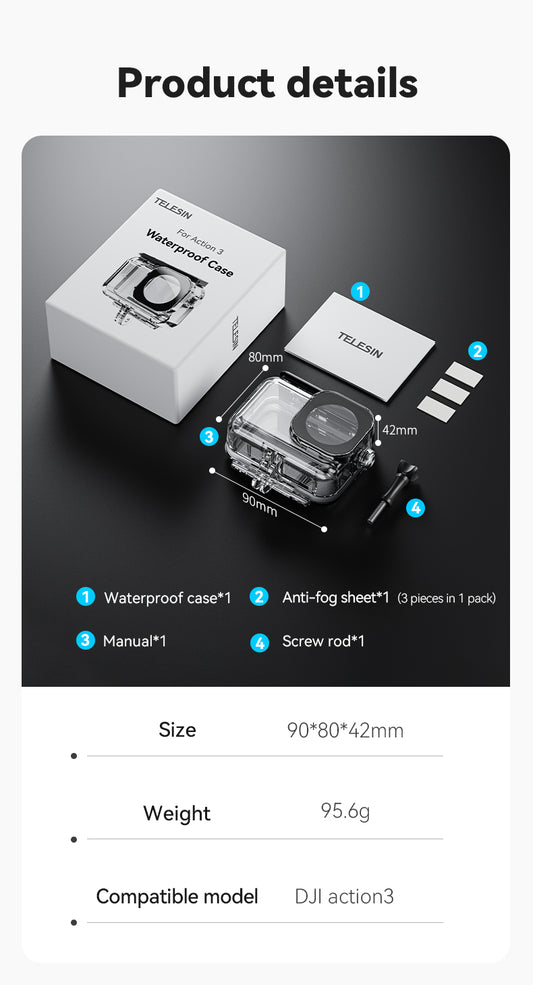 Die Telesin Hülle ist exakt auf die Modelle DJI Osmo Action 3, 4 und 5 zugeschnitten. Dadurch passt die Kamera perfekt und alle Funktionen bleiben gut erreichbar. Mit der mitgelieferten GoPro-Schraube befestigen Sie das Gehäuse einfach an verschiedenen Halterungen und Zubehörteilen.